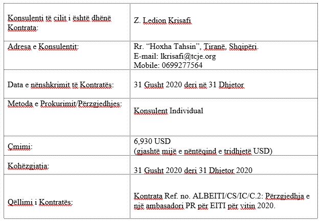 21 Sht Njoftimi i Dhënies së Kontratës -Përzgjedhja e një ambasadori PR për EITI për vitin 2020